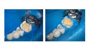 インレーの形態的には機能咬頭の咬頭頂を一部含みコンポジットレジンによるダイレクトボンディングの適応ではない症例ですが患者さんとの話し合いの結果、エナメルのチップや咬頭の破折のリスクを納得いただき今回はダイレクトボンディングによる直接修復となりました。