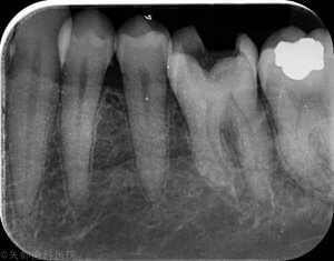 強い自発痛で来院された患者さん。歯がズキズキうずいて夜もなれなかったそうです。口腔内所見では原因歯に大きな虫歯によるう窩が認められ、レントゲン所見では透過像が歯髄腔まで及んでいます。典型的な不可逆性歯髄炎ですね。