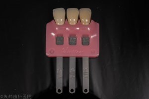 光の直射が強すぎて歯牙表面が白とびしてしまっていますよね。シェードタブも色調をうまく表現できていません。